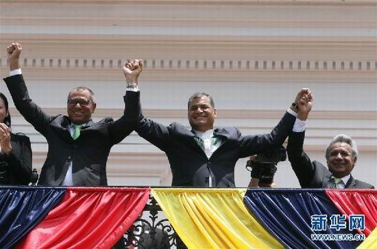 4月3日,在厄瓜多尔基多,厄瓜多尔总统科雷亚(中)和厄执政党主权祖国联盟运动候选人、前副总统莱宁·莫雷诺(右)出席活动。厄瓜多尔全国选举委员会4日宣布,厄执政党候选人莫雷诺当选厄瓜多尔总统。 新华社发