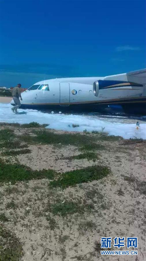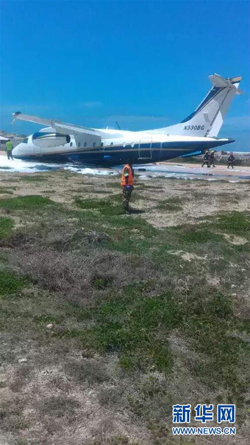 5月30日,在索马里首都摩加迪沙机场,发生事故的轻型飞机停在跑道上。一架轻型飞机30日上午在索马里首都摩加迪沙机场降落时发生事故,所幸未造成人员伤亡。 新华社发(费萨尔·伊塞摄)