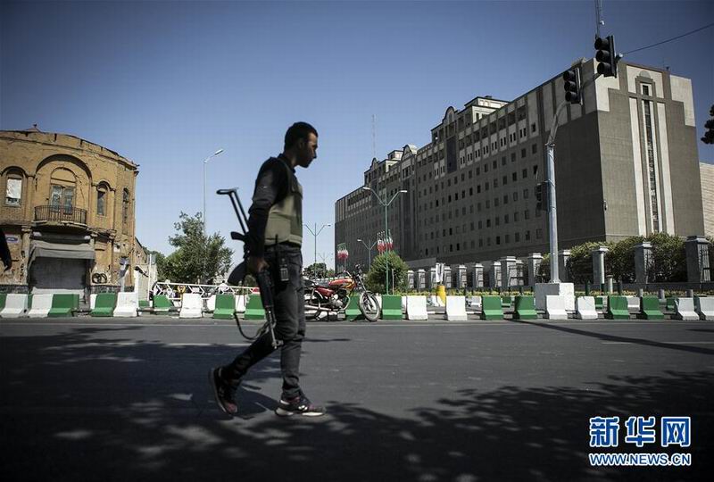 6月7日,在伊朗首都德黑兰,警察在议会大楼外警戒。位于伊朗首都德黑兰的伊朗议会大楼和德黑兰南部的已故最高领袖霍梅尼陵外7日分别发生袭击事件。当地媒体援引伊朗紧急事务部门负责人的话说,目前两起事件已造成至少12人死亡、39人受伤。新华社发(艾哈迈德·哈拉比萨斯摄)