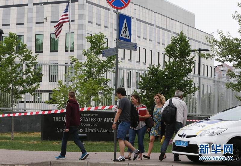 6月8日,在乌克兰基辅,行人从美国驻乌克兰大使馆前走过。