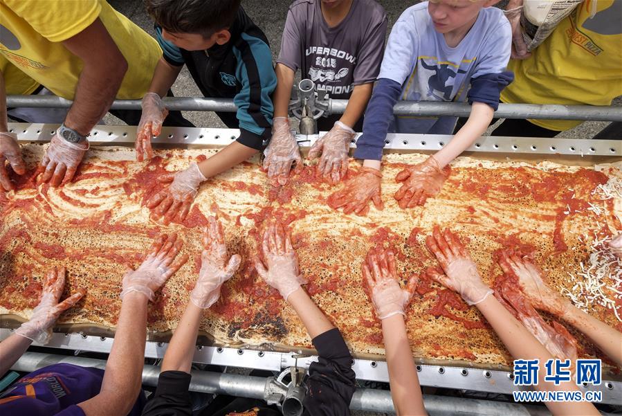 6月10日,在美国加利福尼亚州丰塔纳市,工作人员及志愿者制作世界最长披萨。长度约2.13公里的世界最长比萨10日在加州制作完成。打破此前人们在意大利那不勒斯制作的1.85公里长披萨创下的吉尼斯世界纪录。新华社发 (赵汉荣摄)