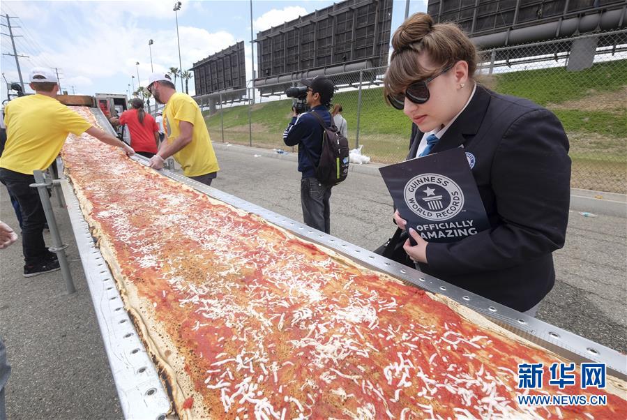 6月10日,在美国加利福尼亚州丰塔纳市,一名吉尼斯认证官检查披萨。长度约2.13公里的世界最长比萨10日在加州制作完成。打破此前人们在意大利那不勒斯制作的1.85公里长披萨创下的吉尼斯世界纪录。新华社发 (赵汉荣摄)