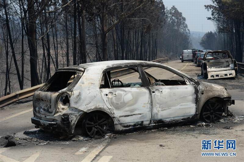 这是6月18日在葡萄牙中部大佩德罗冈地区拍摄的被森林大火烧毁的汽车。新华社记者张立云摄