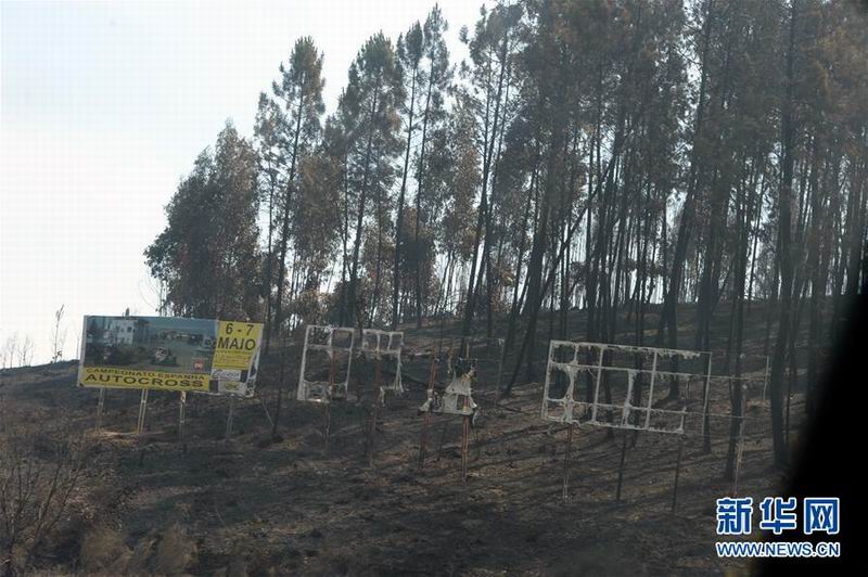 这是6月18日在葡萄牙中部大佩德罗冈地区拍摄的被森林大火烧毁的广告牌。新华社记者张立云摄