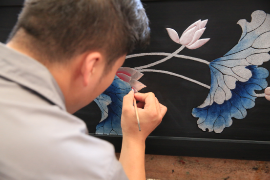 在宽阔的工作室里,数十位“手艺人”或刷漆、或打磨、或绘纹样……一件件推光漆艺术品在他们的手指间慢慢蜕变,最终变得“明艳动人”。