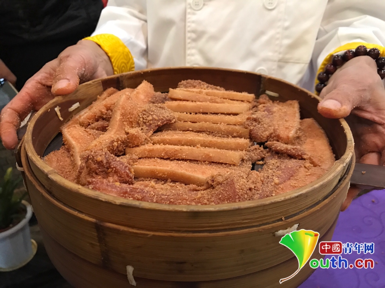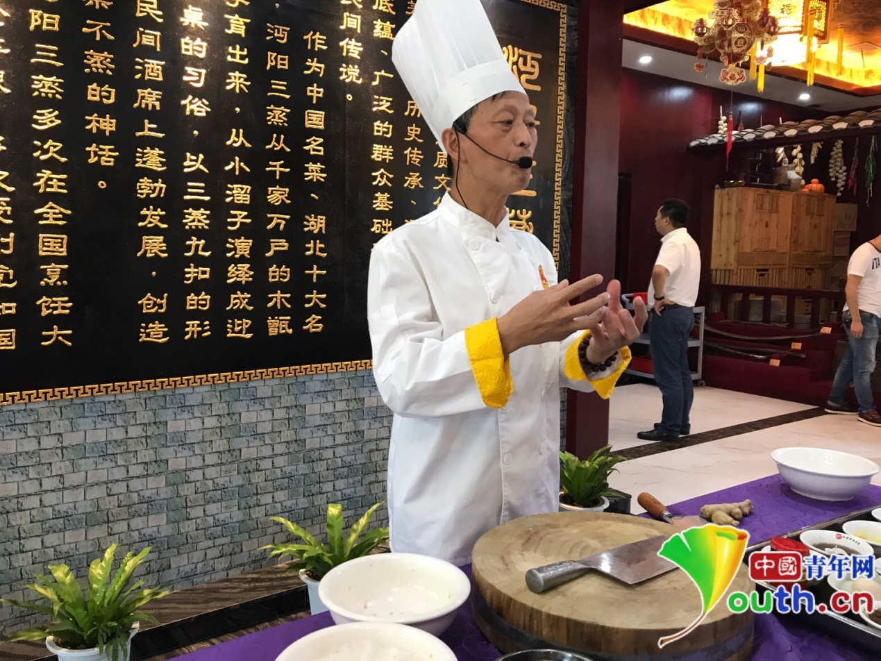 正在讲解沔阳三蒸做法的李和鸣是沔阳三蒸代表性传承人,从事沔阳三蒸烹饪已40年有余。中国青年网见习记者 张潼 摄