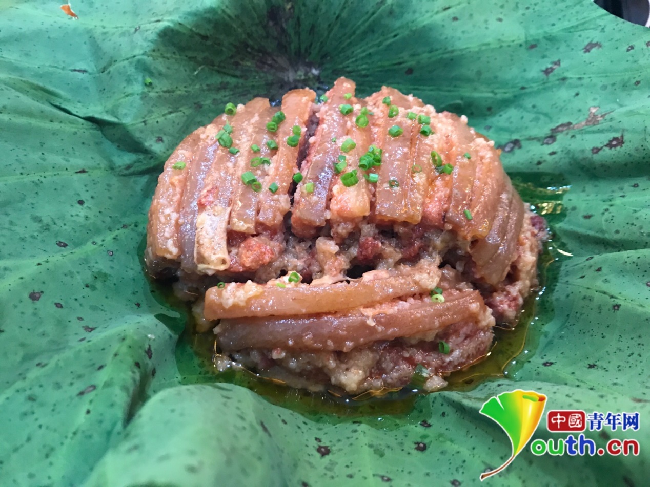 一片片码在荷叶中间的粉蒸肉,米粉包裹均匀,夹一筷入口,肥而不腻。中国青年网 见习记者张潼 摄
