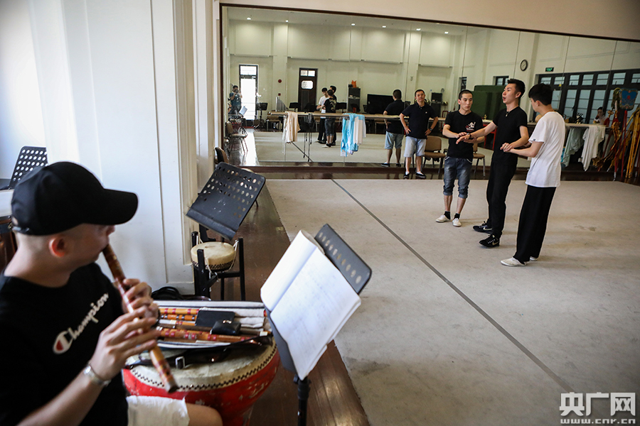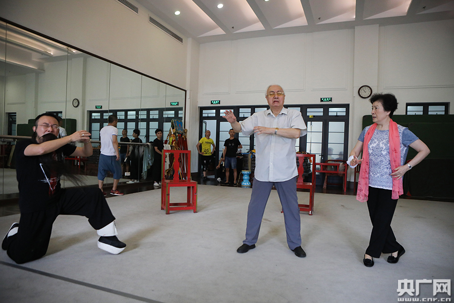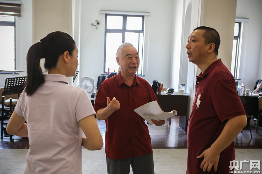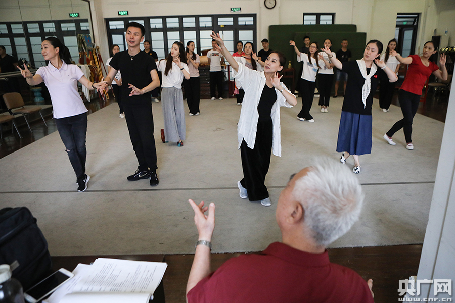 老中青三代同台参演也让更多青年昆剧演员有了更充分的学习机会。图为昆剧《长生殿》导演、著名昆剧表演艺术家张铭荣老师在为年轻演员指导表演。