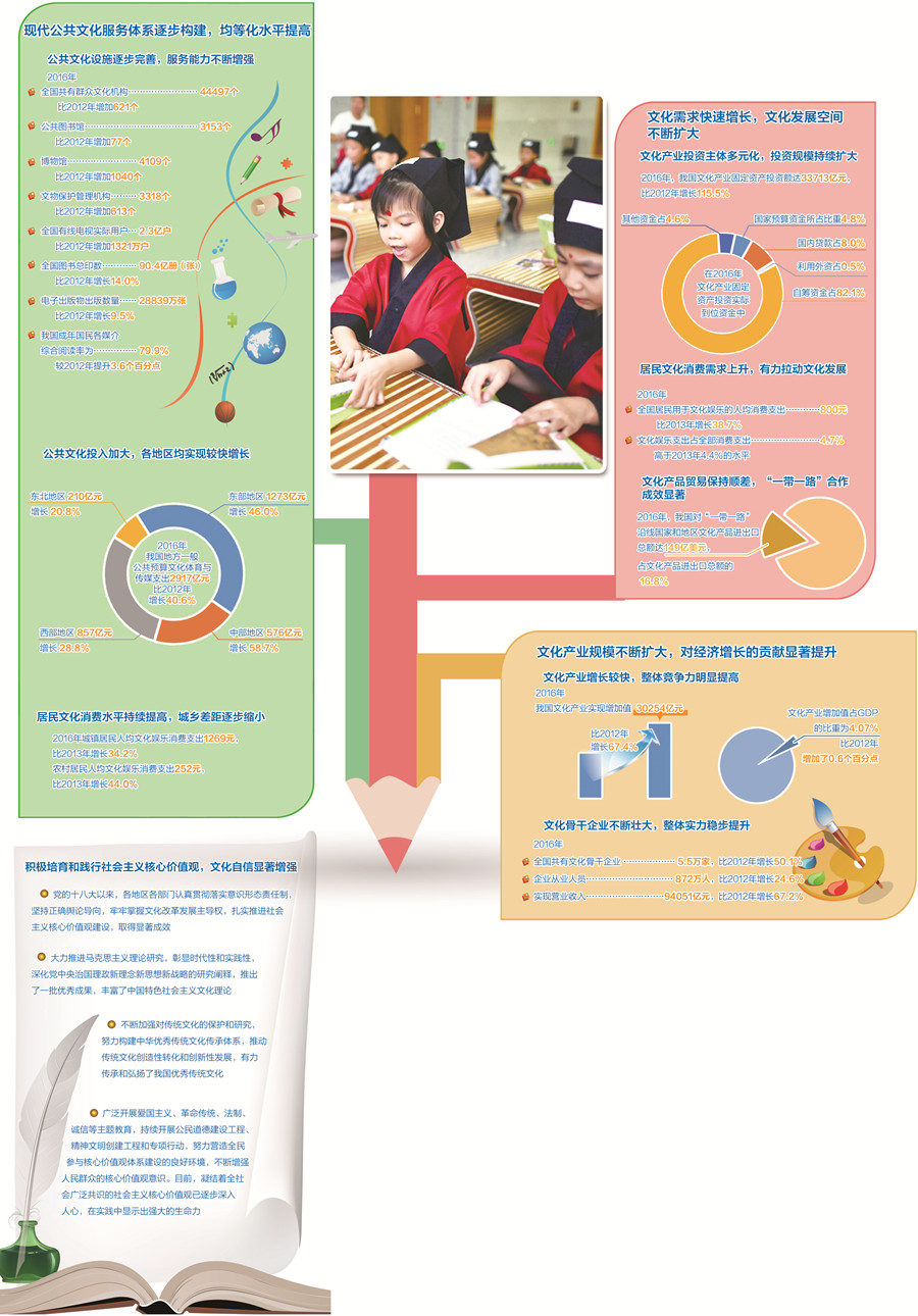 一个国家、一个民族的强盛,总是以文化兴盛为支撑的。党的十八大以来,在以习近平同志为核心的党中央领导下,各地区各部门全面推进文化体制改革,积极培育和践行社会主义核心价值观,现代公共文化服务体系初步形成,公共文化服务网络更加完善,文化产业规模不断扩大,文物保护状况明显改善。5年来,文化产业对国民经济贡献持续加大,文化自信显著增强,为稳步推进文化强国建设、实现全面建成小康社会目标提供了有力支撑。