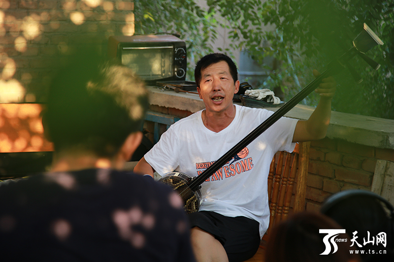 窦永虎在演奏乐器,为新疆曲子伴奏。(图片由通讯员徐文玲提供)