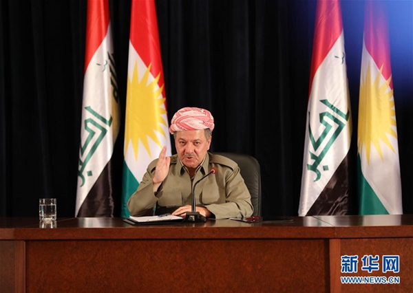 资料图:9月24日,在伊拉克埃尔比勒,伊拉克库尔德自治区(库区)主席马苏德·巴尔扎尼出席记者会。新华网发(哈利勒·达伍德摄)