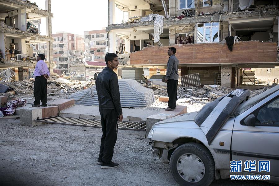 11月13日,在伊朗萨尔波勒扎哈卜,人们站在受损建筑前。据伊朗伊斯兰共和国通讯社13日报道,靠近伊朗西部边境地区的伊拉克北部12日发生的强烈地震已在伊朗震区造成至少328人死亡。新华社发(艾哈迈德·哈拉比萨斯摄)