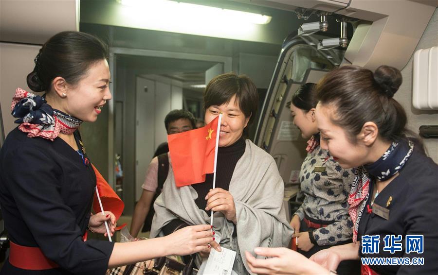 12月3日凌晨,在由印度尼西亚巴厘岛飞往中国上海的东方航空公司MU5030次航班上,乘务员为中国旅客发放国旗。当日,由于风向条件许可,受印度尼西亚巴厘岛阿贡火山喷发影响的巴厘岛伍拉莱国际机场继续开放,中国游客继续撤离巴厘岛。 新华社记者 杜宇 摄