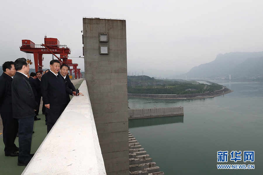 4月24日下午,中共中央总书记、国家主席、中央军委主席习近平来到三峡大坝,详细了解三峡工程建设、发电、水利、通航、生态保护等方面的情况。这是习近平视察左岸发电厂后发表重要讲话。新华社记者 谢环驰 摄