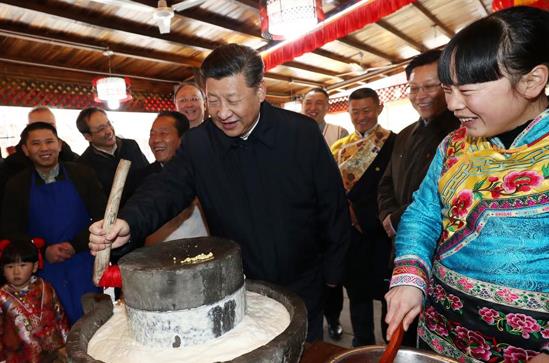 2018年2月,习近平在汶川县映秀镇同居民群众一起磨豆花。来源:新华网