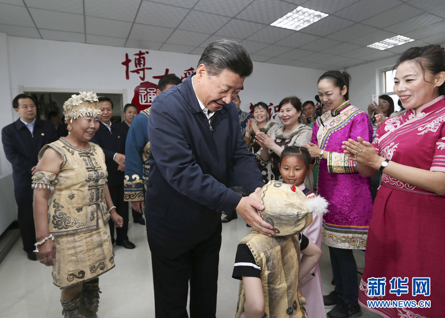 习近平在黑龙江同江市八岔村,同身着民族服装,正在学习赫哲族特有的伊玛堪说唱艺术的村民们亲切交流。