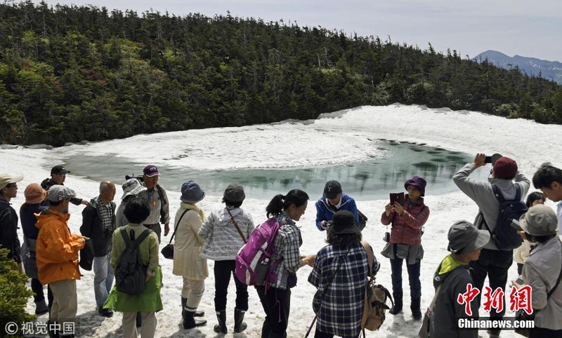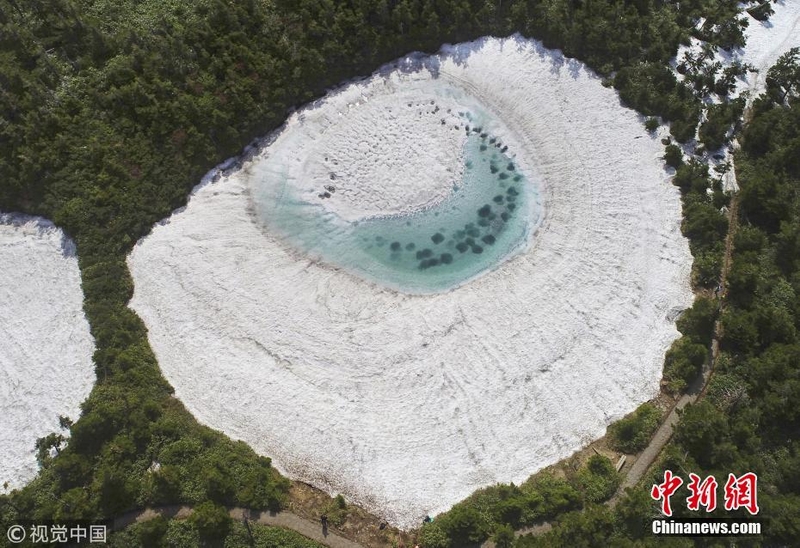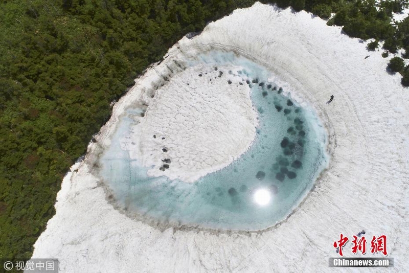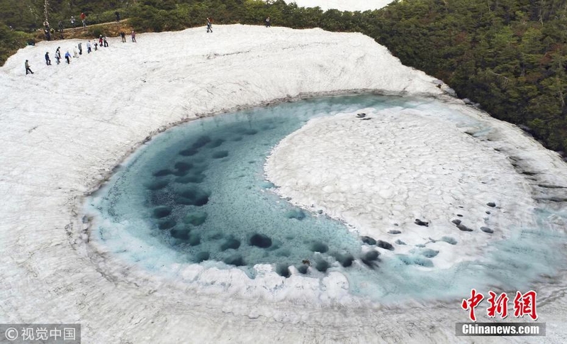 当地时间2018年6月5日,日本,在横跨岩手县与秋田县的八幡平山顶附近的“镜沼”,伴随着积雪融化,日前出现了奇特的“龙眼”景象。据报道,八幡平“龙眼”奇景只在每年5月下旬至6月初的雪融期间短暂出现。当地旅游协会以此为卖点展开宣传,吸引了众多游客到访。 图片来源:视觉中国