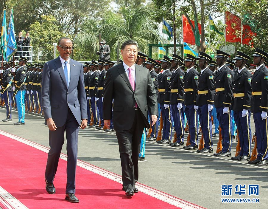 习近平和夫人彭丽媛抵达总统府时,卡加梅和夫人珍妮特上前迎接。两国元首登上检阅台。军乐队奏中卢两国国歌。在卡加梅陪同下,习近平检阅仪仗队。习近平和彭丽媛同卢方主要官员握手。卡加梅夫妇同中方陪同人员握手。身着民族服装的当地民众,通过别具特色的卢旺达舞蹈和鼓乐表演,抒发对习近平到访的激动和喜悦。