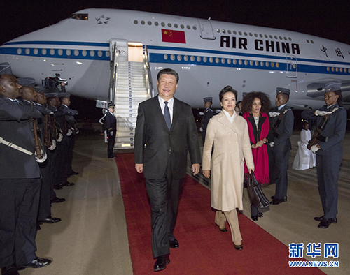当地时间晚8时40分许,习近平乘坐的专机抵达比勒陀利亚沃特克鲁夫军用机场。习近平和夫人彭丽媛受到南非外长西苏鲁等政府高级官员热情迎接。南非儿童向彭丽媛献花。礼兵整装肃立在红地毯两侧,行注目礼。