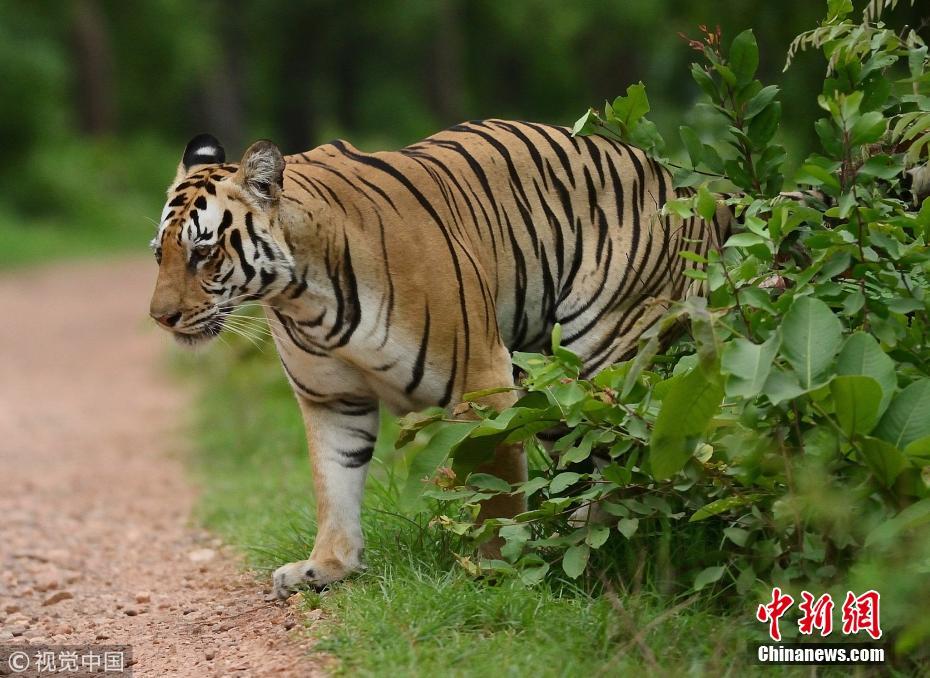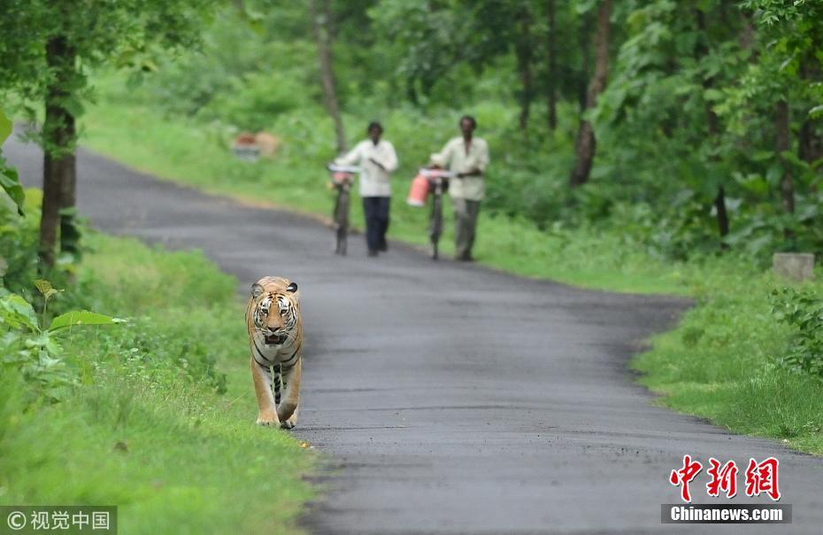 2018年8月28日消息,在印度Umred Karandla野生动物保护区内,一只孟加拉虎突然出现在公路上,两个骑自行车经过的村民对它的出现感到震惊,警惕的与它保持着合理的距离。 图片来源:视觉中国