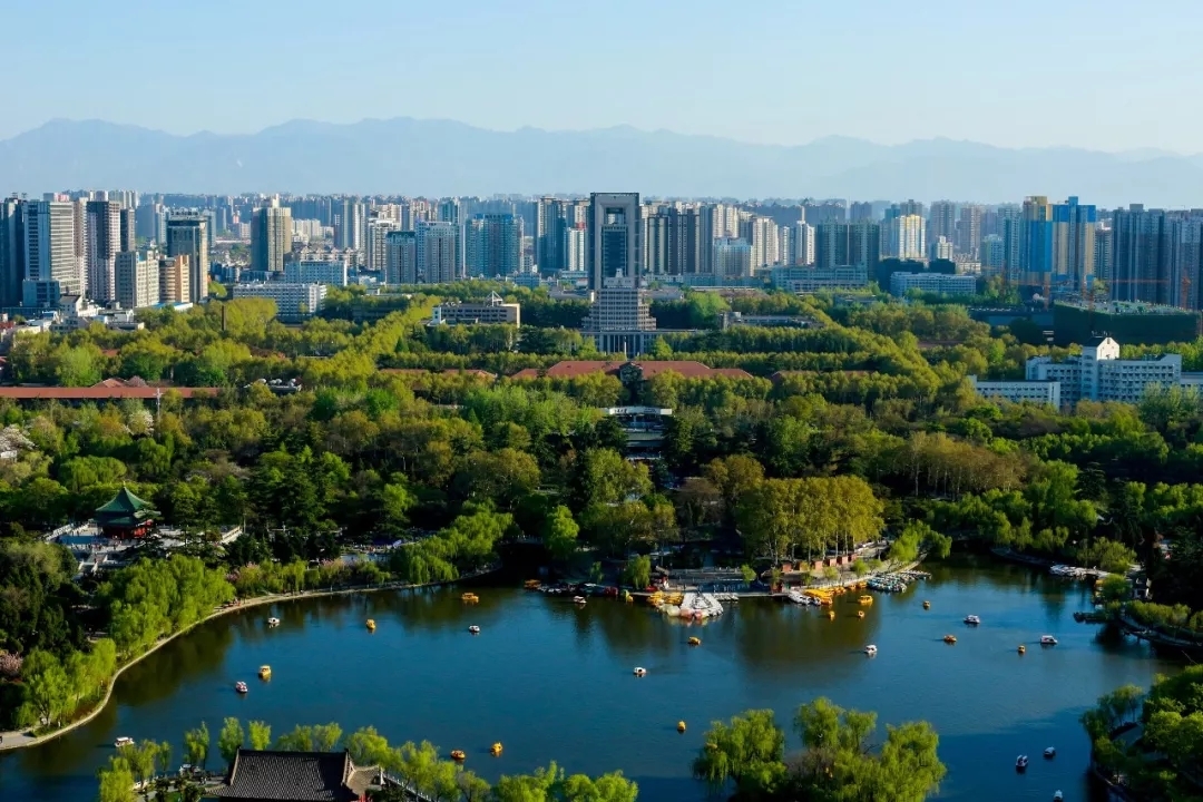 这是从西安兴庆宫公园俯瞰西安交大校园(2015年4月13日摄)。