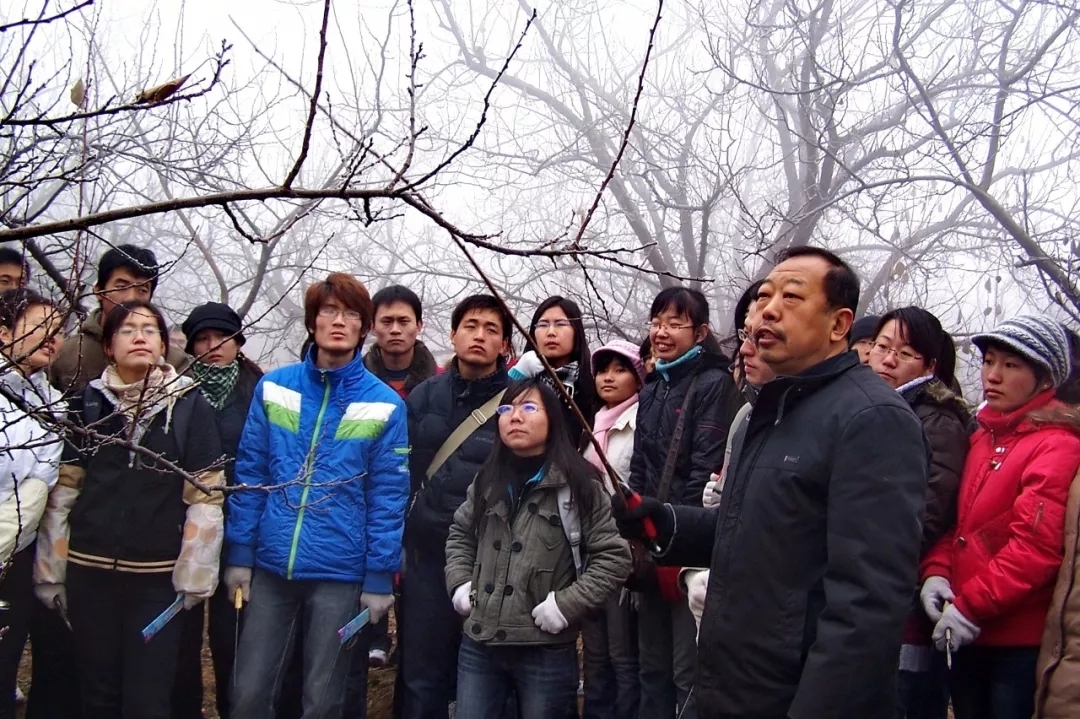 李保国(前左)在河北省内丘县岗底村向村民讲解果树修剪知识(2016年1月27日摄)。新华社记者 朱旭东 摄