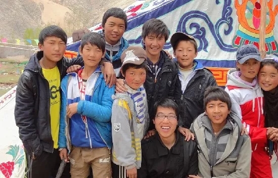 图为志愿者闫俊良和藏族学生们在一起合影留念。图片来源:新华网