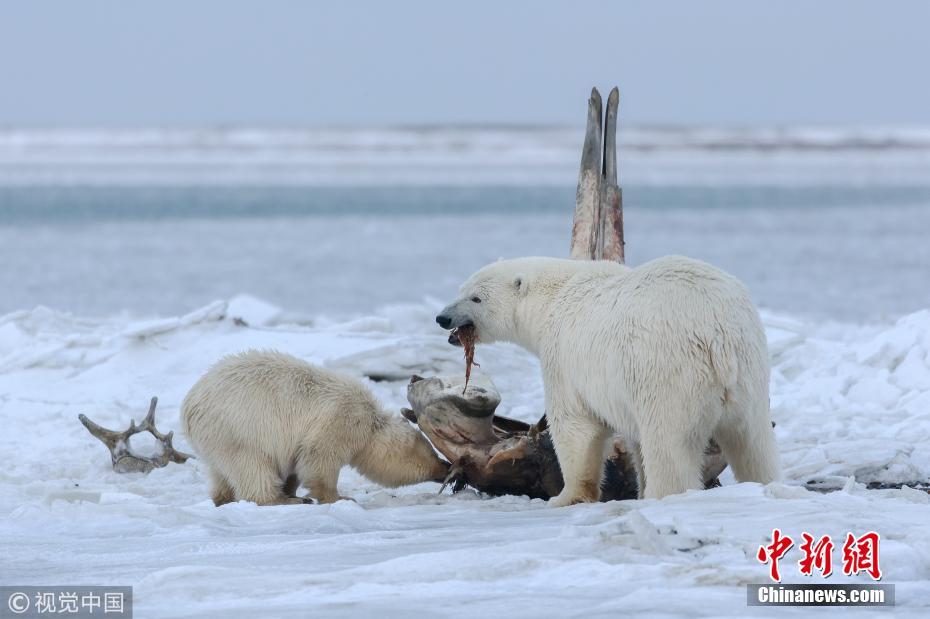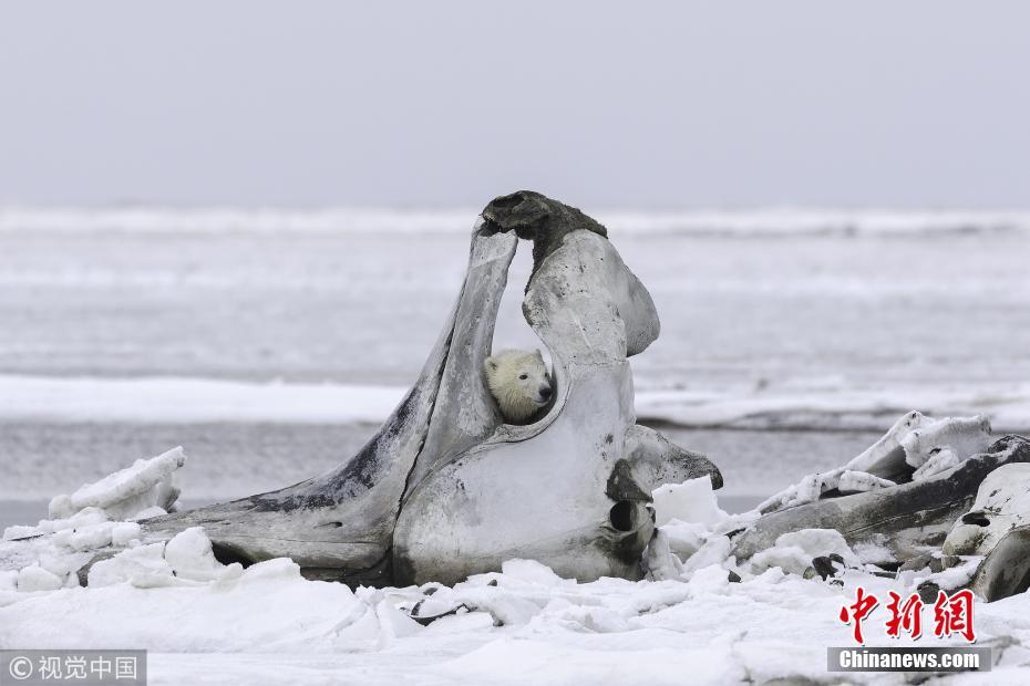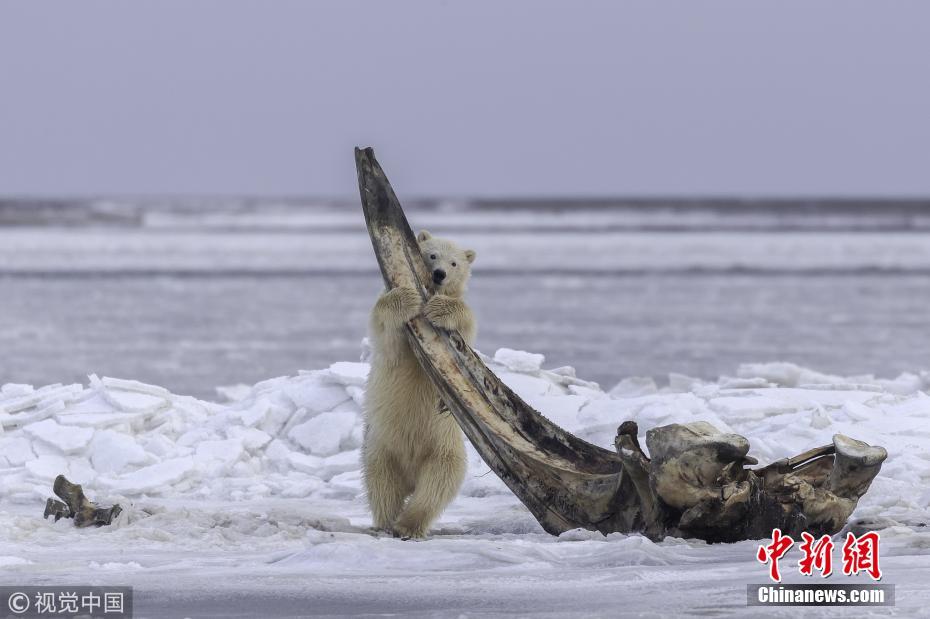 11月1日讯(具体拍摄时间不详),美国阿拉斯加州,一只北极熊妈妈带着幼崽们外出觅食,发现了一节长4.5米的北极露脊鲸骸骨。75吨重的鲸鱼对因纽皮亚特人来说是神圣的,他们每年要吃三次鲸鱼,把骨头放在指定的地方,让北极熊吃完粘在骨头上的碎肉。摄影师Eiji Itoyama为拍摄此照片在位于北冰洋边缘的阿拉斯加卡克托维克村停留了5天。图片来源:视觉中国