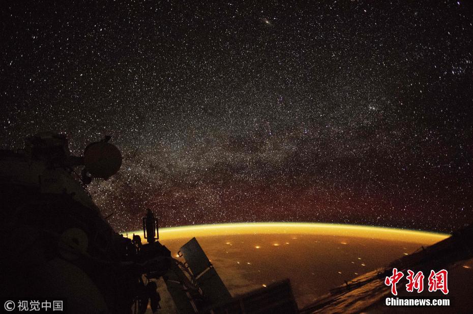 2018年10月7日,国际空间站拍到的围绕地球的橙色色调“大气光”。这种现象发生在紫外线辐射到大气中的分子时,产生一个50到400英里高的光带。。图片来源:视觉中国