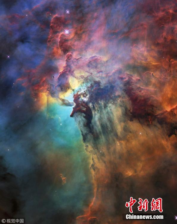 美国宇航局(NASA)和欧洲航天局(ESA)进行了一年一次的通过发布全新的壮丽图片来庆祝哈勃望远镜的发射周年活动。仔细观察图片,可以在中心附近看到一颗闪闪发光的年轻恒星。哈勃研究小组表示,“这是Herschel 36,它通过吹走一些气体形成周围的云层,形成密集且密度较低的区域。”ESA的哈勃站点将泻湖星云描述为一个宽度为55光年和高度为20光年的“庞然大物”,距离地球约4000光年。图片来源:视觉中国