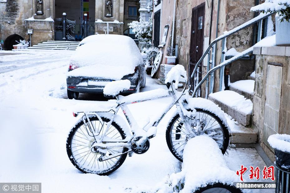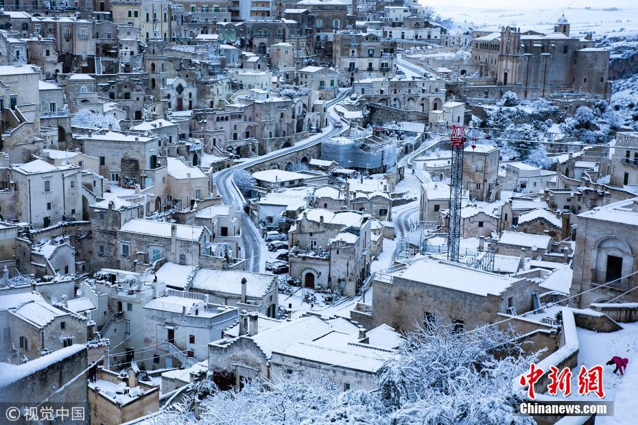当地时间2019年1月3日,欧洲多地迎来降雪天气,大雪将城市变成了一个个浪漫的冰雪世界。图为意大利蒙大拿州马泰拉市雪景。图片来源:视觉中国