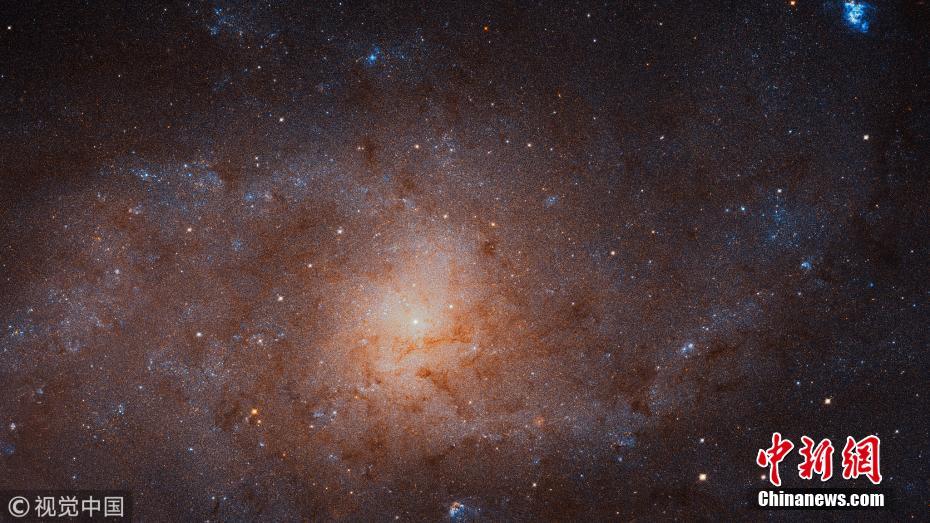 近日,美国宇航局(NASA)最新公布的哈勃望远镜照片展示了三角座星系(Triangulum Galaxy)中心区域及其内部旋臂的壮观景象。 图片来源:视觉中国
