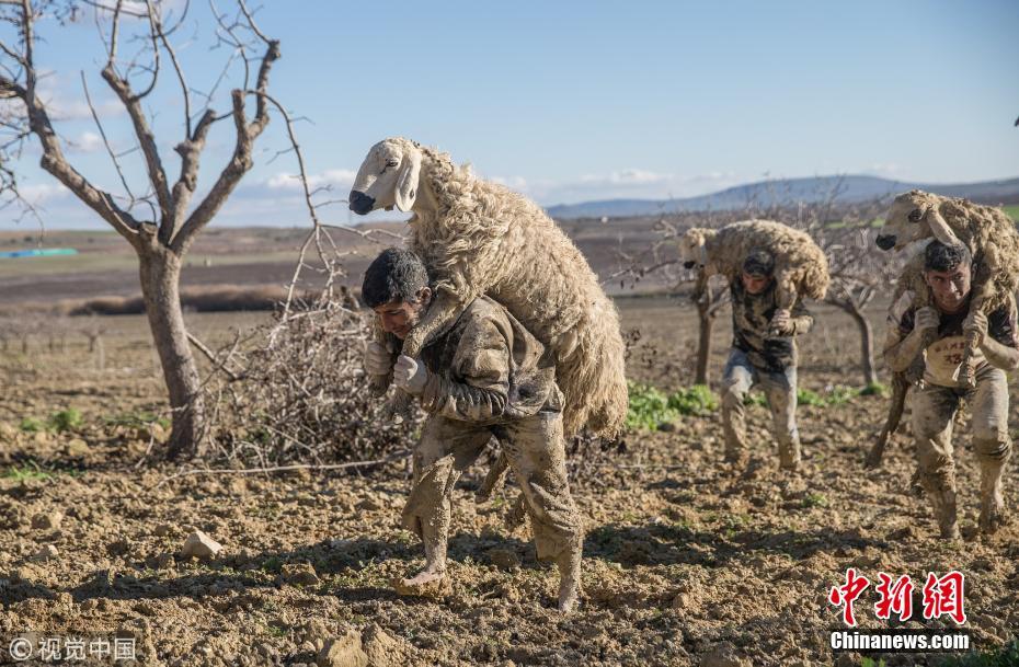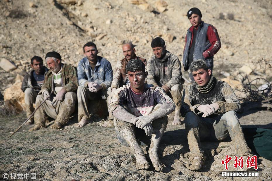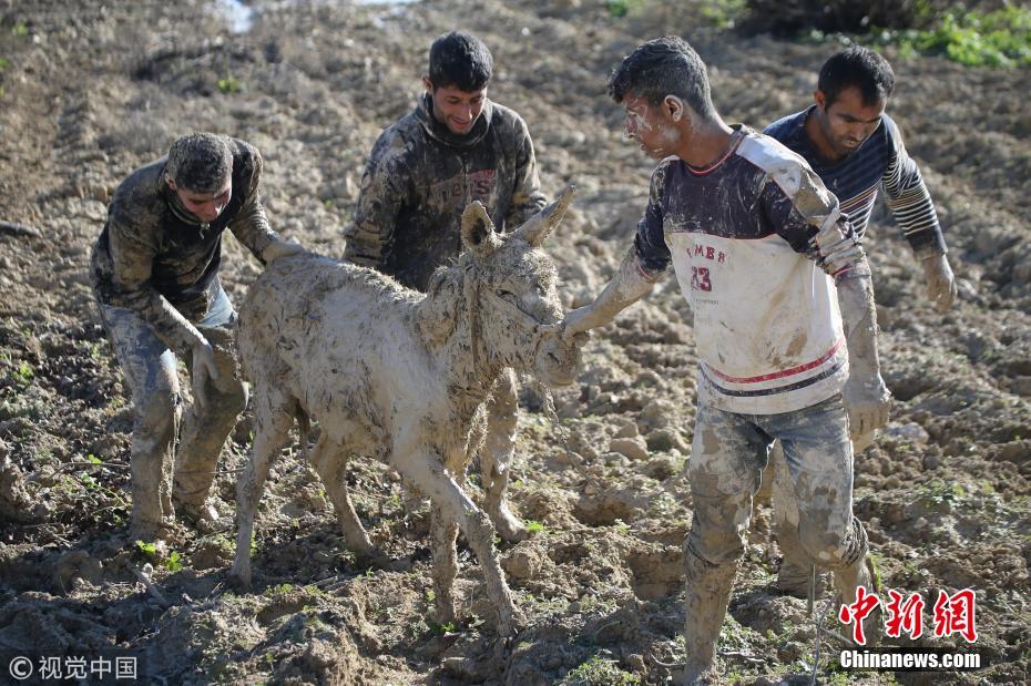 2019年1月9日,人们从泥浆中救出羊群。在土耳其Sanliurfa,共有67只羊和一头驴被消防队员和当地居民从泥浆中救出。图片来源:视觉中国