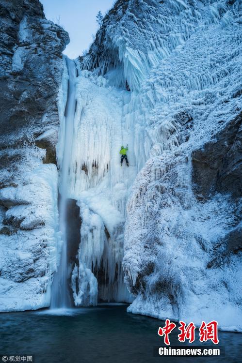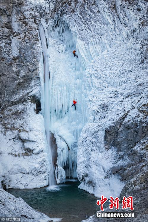 近日,意大利特列斯特Torrente Rosandra瀑布近十年来首次结冰,攀岩爱好者们使用专业设备,在零下7摄氏度的条件下攀爬结冰的瀑布。图片来源:视觉中国