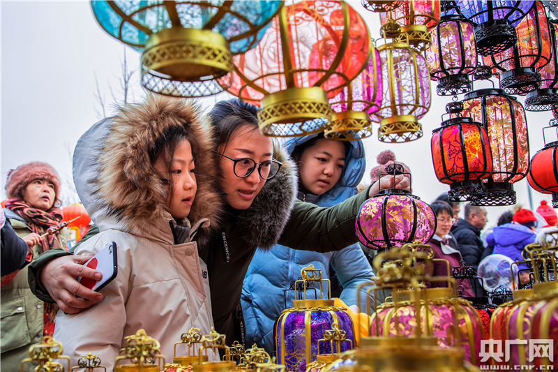 庙会中的游客,在挑选灯笼。(央广网记者 张佳琪 摄)