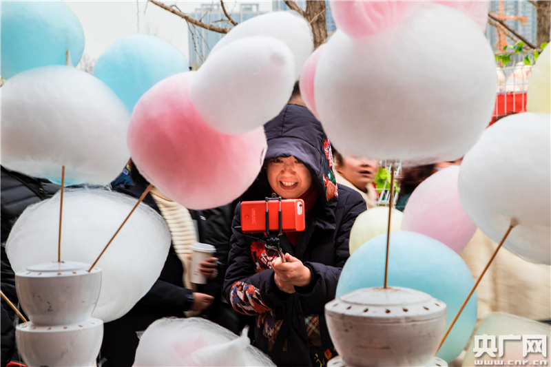 运河文化庙会中的游客在拍摄棉花糖。(央广网记者 张佳琪 摄)