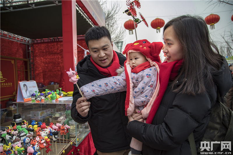 庙会中的游客在给自家孩子挑选纪念品。(央广网记者 张佳琪 摄)