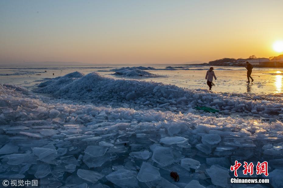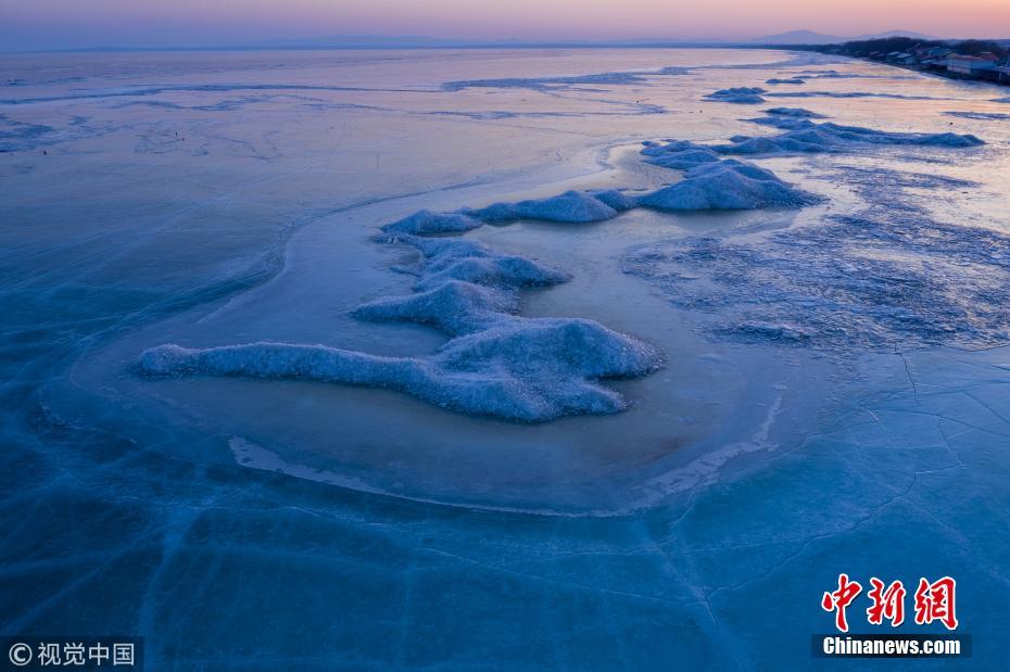 2月23日傍晚,黑龙江鸡西,位于黑龙江东南部的中俄界湖兴凯湖,由于今冬少雪和近期高湿,千里冰封的湖面开始出现少量明水区。夕阳下,千里冰湖蔚蓝一片,如梦如幻。孙长山 摄 图片来源:视觉中国