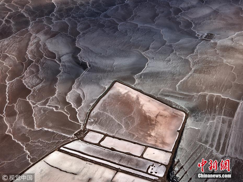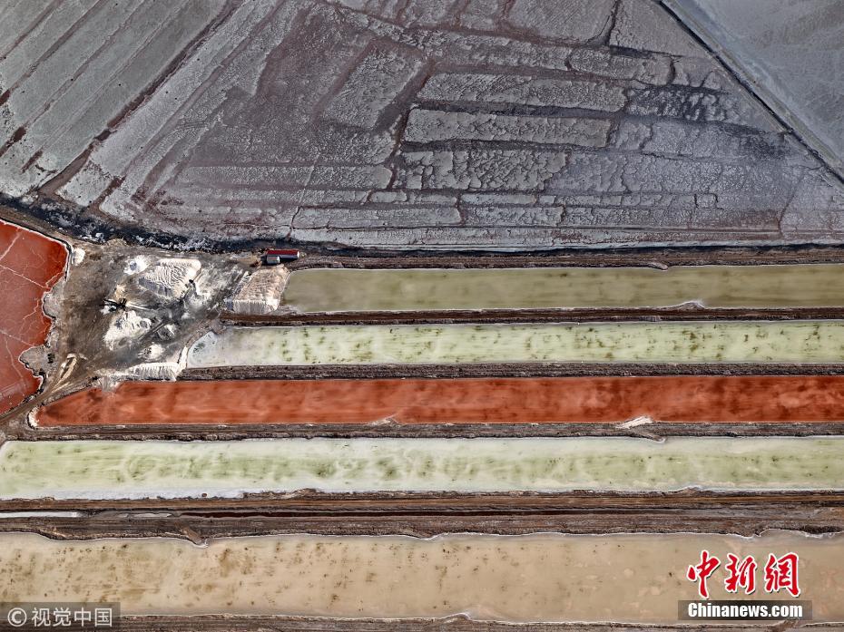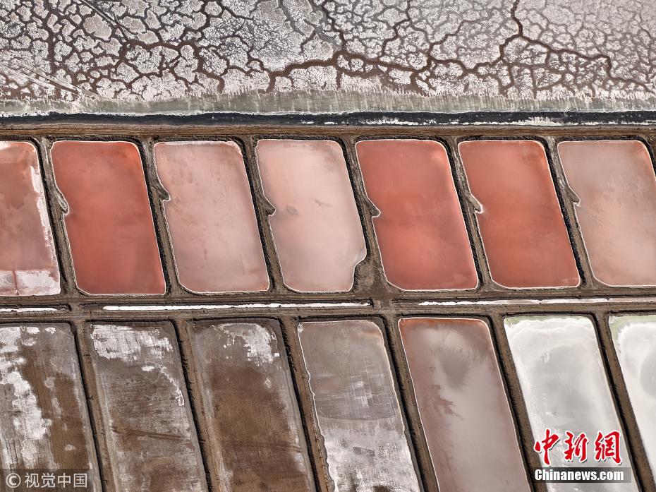 2018年4月1日讯(具体拍摄时间不详),墨西哥下加利福尼亚州,航拍当地的盐池如同巨大的“眼影盘”。当地开发出的大量盐池产盐量十分可观,约占世界盐产量的30%以上。图片来源:视觉中国