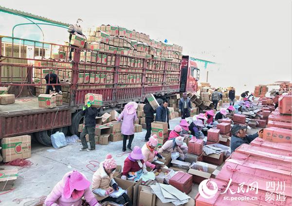 四川省凉山州盐源县邮政局物流中心的工作人员正忙着将苹果装箱寄出。人民网朱虹摄