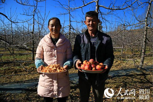 村民叶方友和老婆捧着今年丰收的苹果与自制的苹果片。人民网朱虹摄