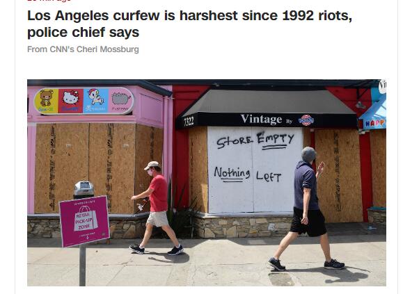 【环球网报道】美国有线电视新闻网(CNN)刚刚消息称,美国洛杉矶警察局长米歇尔 穆尔(Michel Moore)表示,洛杉矶实行了12小时的宵禁,这是该市自1992年骚乱以来最严厉的一次宵禁。