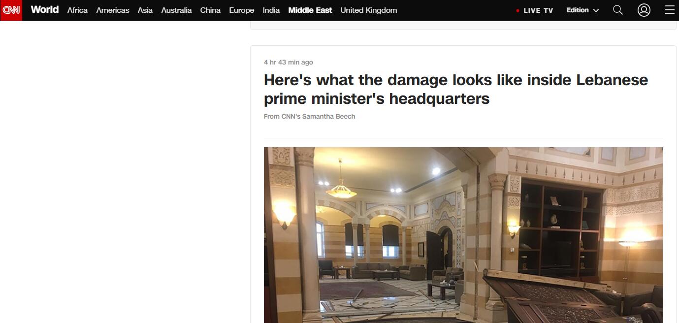 CNN还援引黎巴嫩官方媒体消息称,爆炸还对黎巴嫩总统府巴卜达宫造成了相当大的破坏。
