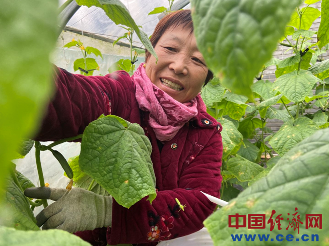 过去刘美莲家一直靠种地为生,自己、丈夫和儿子一家三口靠家里的五六亩花生地勉强度日:“我这种年纪,出去打工人家厂子都不要的,只能在家里、在地里。”可是自从示范园区建设以来,50多岁的刘美莲在这里找到了一份工作,照料大棚里几百株黄瓜,“刚来时候有技术员培训,现在什么都会了,这些黄瓜都是我从小侍弄到现在这么大的。”