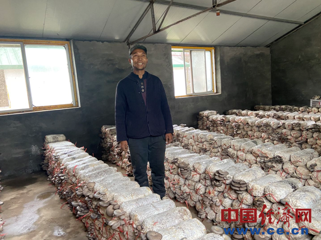 图为李汉章在自己的平菇种植大棚中。 经济日报-中国经济网 梁木 摄