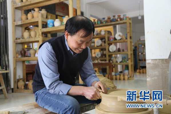 花茂制陶手艺第四代传承人母先才制作陶艺摆件。新华网 蔡连素 摄