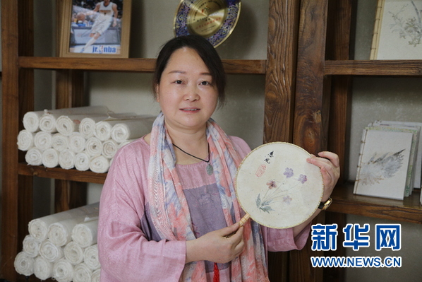 “花茂人家”文化工坊负责人张胜迪向游客展示扇子。新华网 蔡连素 摄