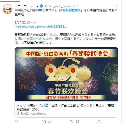 2020年1月24日晚,日本将在线直播中国春晚。来源:日本视频网站niconico官方社交媒体账户截图