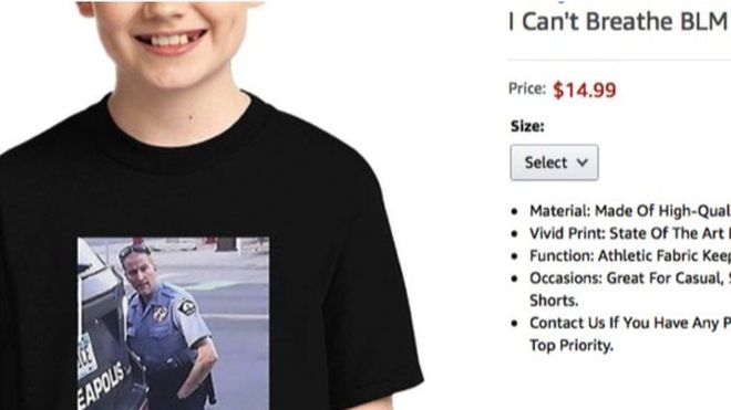 【环球网报道 记者 丁洁芸】当地时间9日,被白人警察暴力执法致死的非裔男子弗洛伊德的葬礼在休斯敦举行。同一天,亚马逊平台被曝出现多款印有弗洛伊德遭警察“跪脖锁喉”现场图片的衣帽,其中包括儿童款、男女款T恤及帽子等。虽然据英国广播公司(BBC)9日消息,其中一款儿童T恤已经被下架,但印有相同图片的其他产品仍在该平台销售。