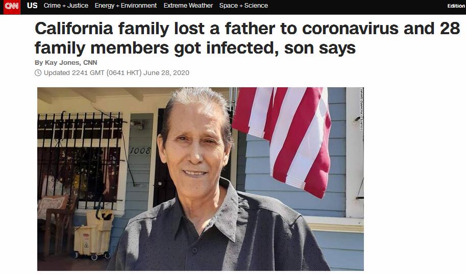 【环球网报道 记者 张晓雅】美国有线电视新闻网(CNN)28日报道称,美国加利福尼亚州一家庭至少28名成员感染新冠病毒,其中1人死亡。